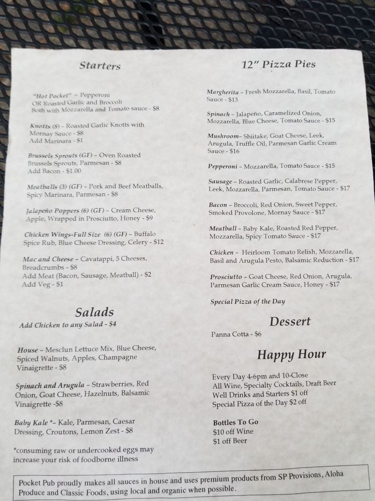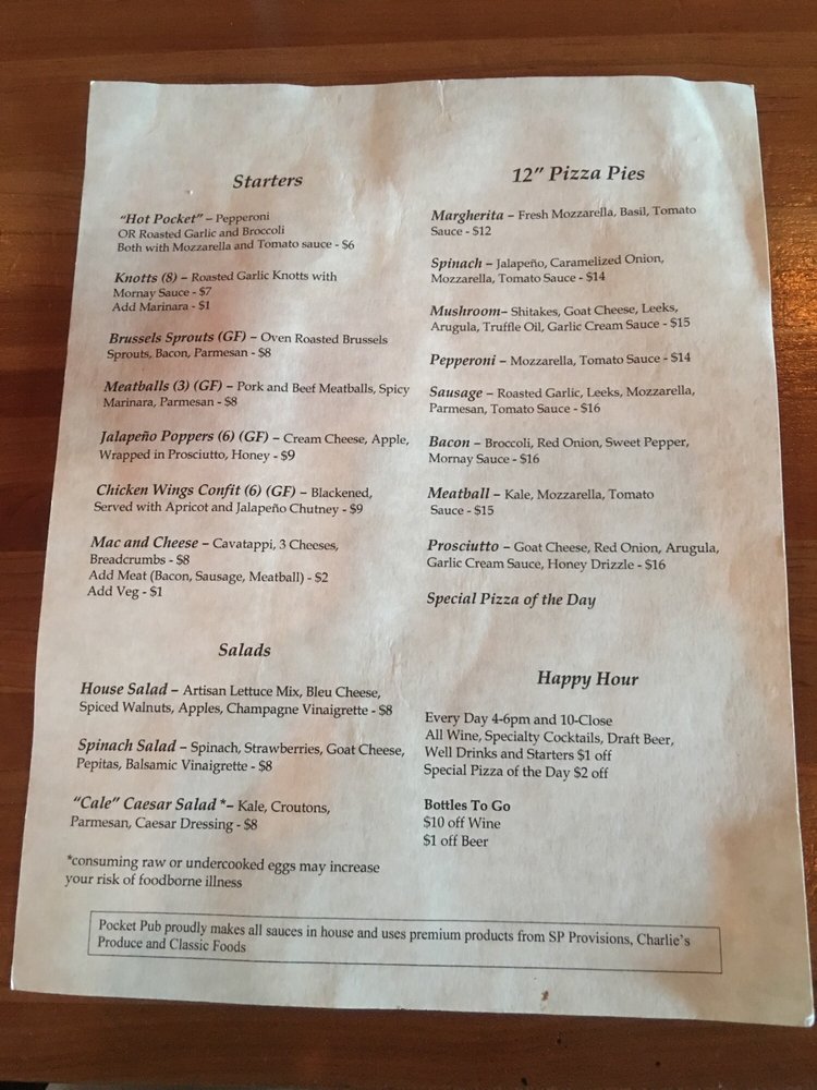 Their menu features a variety of salads, starters like chicken wings and meatballs, and unique pizzas such as the Mushroom with shiitake and truffle oil, or the Sausage with fennel sausage and calabrese pepper. The thoughtful combination of flavors and high-quality ingredients will leave you satisfied and eager to come back for more. Don't miss out on their happy hour specials and pool table for added entertainment. The Pocket Pub truly stands out as a must-visit spot for pizza lovers in the area.
